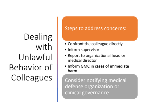 Dealing with Unlawful Behavior of ColleaguesSteps to address concerns:%u2022 Confront the colleague directly%u2022 Inform supervisor%u2022 Report to organizational head or medical director%u2022 Inform GMC in cases of immediate harmConsider notifying medical defense organization or clinical governance