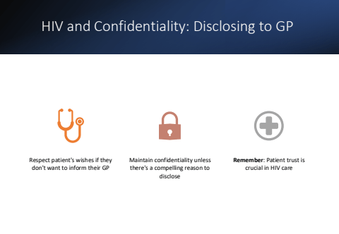 HIV and Confidentiality: Disclosing to GPRespect patient's wishes if they don't want to inform their GPMaintain confidentiality unless there's a compelling reason to discloseRemember: Patient trust is crucial in HIV care