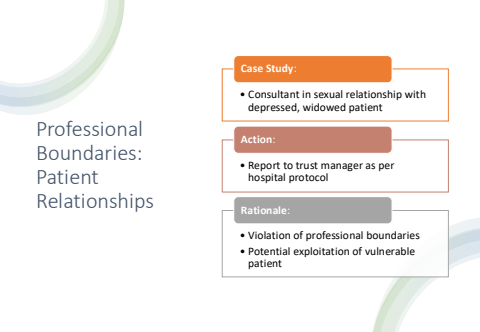 Professional Boundaries: Patient Relationships%u2022 Consultant in sexual relationship with depressed, widowed patientCase Study:%u2022 Report to trust manager as per hospital protocolAction:%u2022 Violation of professional boundaries%u2022 Potential exploitation of vulnerable patientRationale: