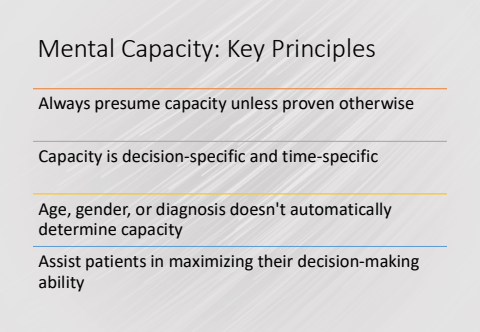 Mental Capacity: Key PrinciplesAlways presume capacity unless proven otherwiseCapacity is decision-specific and time-specificAge, gender, or diagnosis doesn't automatically determine capacityAssist patients in maximizing their decision-making ability
