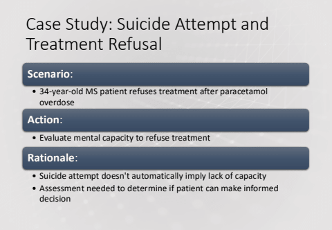 Case Study: Suicide Attempt and Treatment RefusalScenario:%u2022 34-year-old MS patient refuses treatment after paracetamol overdoseAction:%u2022 Evaluate mental capacity to refuse treatmentRationale:%u2022 Suicide attempt doesn't automatically imply lack of capacity%u2022 Assessment needed to determine if patient can make informed decision