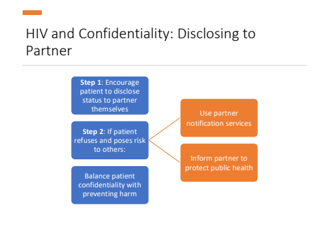 HIV and Confidentiality: Disclosing to PartnerStep 1: Encourage patient to disclose status to partner themselvesStep 2: If patient refuses and poses risk to others:Use partner notification servicesInform partner to protect public healthBalance patient confidentiality with preventing harm