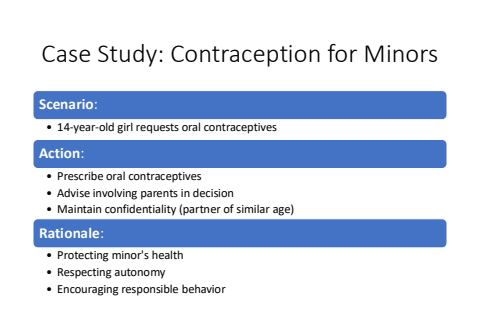 Case Study: Contraception for MinorsScenario:%u2022 14-year-old girl requests oral contraceptivesAction:%u2022 Prescribe oral contraceptives%u2022 Advise involving parents in decision%u2022 Maintain confidentiality (partner of similar age)Rationale:%u2022 Protecting minor's health%u2022 Respecting autonomy%u2022 Encouraging responsible behavior