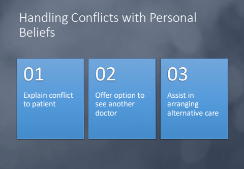 Handling Conflicts with Personal BeliefsExplain conflict to patient01Offer option to see another doctor02Assist in arranging alternative care03