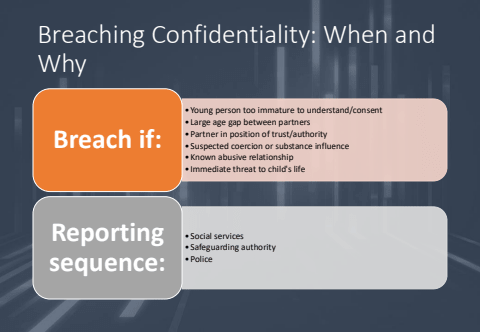 Breaching Confidentiality: When and Why%u2022Young person too immature to understand/consent%u2022Large age gap between partners%u2022Partner in position of trust/authority%u2022Suspected coercion or substance influence%u2022Known abusive relationship%u2022Immediate threat to child's lifeBreach if:%u2022Social services%u2022Safeguarding authority%u2022PoliceReporting sequence: