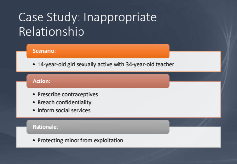 Case Study: Inappropriate Relationship%u2022 14-year-old girl sexually active with 34-year-old teacherScenario:%u2022 Prescribe contraceptives%u2022 Breach confidentiality%u2022 Inform social servicesAction:%u2022 Protecting minor from exploitationRationale: