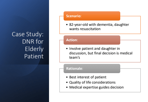 Case Study: DNR for Elderly Patient%u2022 82-year-old with dementia, daughter wants resuscitationScenario:%u2022 Involve patient and daughter in discussion, but final decision is medical team%u2019sAction:%u2022 Best interest of patient%u2022 Quality of life considerations%u2022 Medical expertise guides decisionRationale: