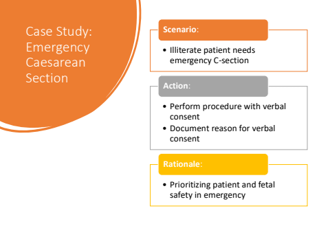 Case Study: Emergency Caesarean Section%u2022 Illiterate patient needs emergency C-sectionScenario:%u2022 Perform procedure with verbal consent%u2022 Document reason for verbal consentAction:%u2022 Prioritizing patient and fetal safety in emergencyRationale: