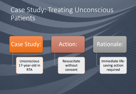 Case Study: Treating Unconscious PatientsCase Study:Unconscious 17-year-old in RTAAction:Resuscitate without consentRationale:Immediate lifesaving action required