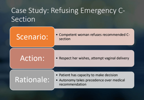 Case Study: Refusing Emergency CSection%u2022 Competent woman refuses recommended CScenario: sectionAction: %u2022 Respect her wishes, attempt vaginal delivery%u2022 Patient has capacity to make decision%u2022 Autonomy takes precedence over medical recommendationRationale: