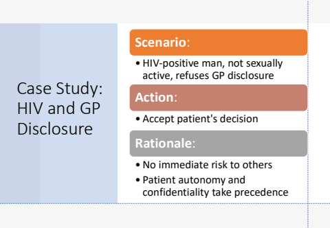 Case Study: HIV and GP DisclosureScenario:%u2022 HIV-positive man, not sexually active, refuses GP disclosureAction:%u2022 Accept patient's decisionRationale:%u2022 No immediate risk to others%u2022 Patient autonomy and confidentiality take precedence