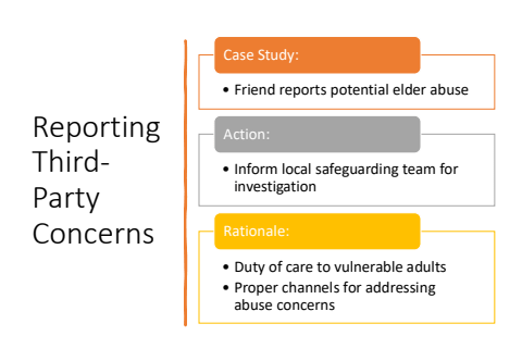Reporting ThirdParty Concerns%u2022 Friend reports potential elder abuseCase Study:%u2022 Inform local safeguarding team for investigationAction:%u2022 Duty of care to vulnerable adults%u2022 Proper channels for addressing abuse concernsRationale: