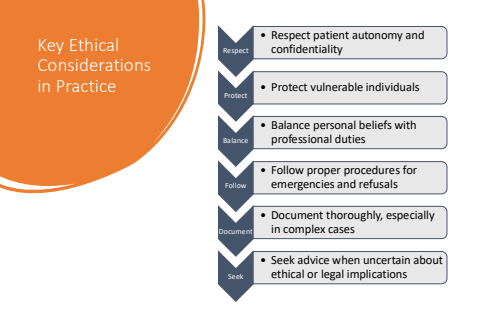 Key Ethical Considerations in PracticeRespect%u2022 Respect patient autonomy and confidentialityProtect%u2022 Protect vulnerable individualsBalance%u2022 Balance personal beliefs with professional dutiesFollow%u2022 Follow proper procedures for emergencies and refusalsDocument%u2022 Document thoroughly, especially in complex casesSeek%u2022 Seek advice when uncertain about ethical or legal implications