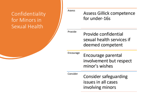 Confidentiality for Minors in Sexual HealthAssess Assess Gillick competence for under-16sProvide Provide confidential sexual health services if deemed competentEncourage Encourage parental involvement but respect minor's wishesConsider Consider safeguarding issues in all cases involving minors