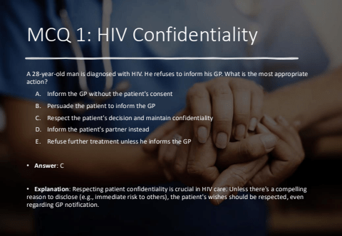 MCQ 1: HIV ConfidentialityA 28-year-old man is diagnosed with HIV. He refuses to inform his GP. What is the most appropriate action?A. Inform the GP without the patient's consentB. Persuade the patient to inform the GPC. Respect the patient's decision and maintain confidentialityD. Inform the patient's partner insteadE. Refuse further treatment unless he informs the GP%u2022 Answer: C%u2022 Explanation: Respecting patient confidentiality is crucial in HIV care. Unless there's a compelling reason to disclose (e.g., immediate risk to others), the patient's wishes should be respected, even regarding GP notification.