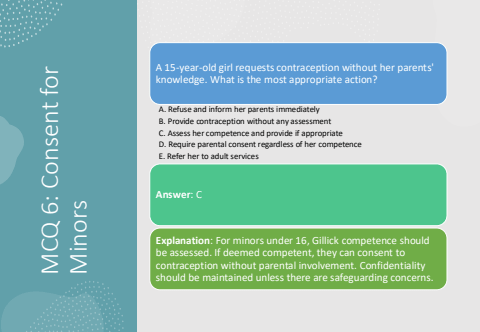 MCQ 6: Consent for MinorsA 15-year-old girl requests contraception without her parents' knowledge. What is the most appropriate action?A. Refuse and inform her parents immediatelyB. Provide contraception without any assessmentC. Assess her competence and provide if appropriateD. Require parental consent regardless of her competenceE. Refer her to adult servicesAnswer: CExplanation: For minors under 16, Gillick competence should be assessed. If deemed competent, they can consent to contraception without parental involvement. Confidentiality should be maintained unless there are safeguarding concerns.