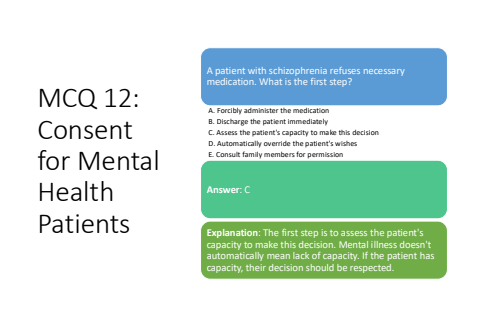 MCQ 12: Consent for Mental Health PatientsA patient with schizophrenia refuses necessary medication. What is the first step?A. Forcibly administer the medicationB. Discharge the patient immediatelyC. Assess the patient's capacity to make this decisionD. Automatically override the patient's wishesE. Consult family members for permissionAnswer: CExplanation: The first step is to assess the patient's capacity to make this decision. Mental illness doesn't automatically mean lack of capacity. If the patient has capacity, their decision should be respected.