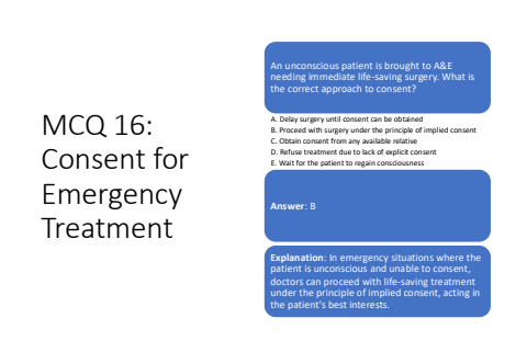 MCQ 16: Consent for Emergency TreatmentAn unconscious patient is brought to A&E needing immediate life-saving surgery. What is the correct approach to consent?A. Delay surgery until consent can be obtainedB. Proceed with surgery under the principle of implied consentC. Obtain consent from any available relativeD. Refuse treatment due to lack of explicit consentE. Wait for the patient to regain consciousnessAnswer: BExplanation: In emergency situations where the patient is unconscious and unable to consent, doctors can proceed with life-saving treatment under the principle of implied consent, acting in the patient's best interests.