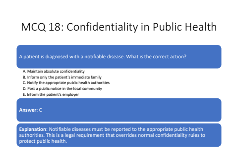 MCQ 18: Confidentiality in Public HealthA patient is diagnosed with a notifiable disease. What is the correct action?A. Maintain absolute confidentialityB. Inform only the patient's immediate familyC. Notify the appropriate public health authoritiesD. Post a public notice in the local communityE. Inform the patient's employerAnswer: CExplanation: Notifiable diseases must be reported to the appropriate public health authorities. This is a legal requirement that overrides normal confidentiality rules to protect public health.