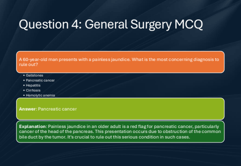 Question 4: General Surgery MCQA 60-year-old man presents with a painless jaundice. What is the most concerning diagnosis to rule out?%u2022 Gallstones%u2022 Pancreatic cancer%u2022 Hepatitis%u2022 Cirrhosis%u2022 Hemolytic anemiaAnswer: Pancreatic cancerExplanation: Painless jaundice in an older adult is a red flag for pancreatic cancer, particularly cancer of the head of the pancreas. This presentation occurs due to obstruction of the common bile duct by the tumor. It's crucial to rule out this serious condition in such cases.