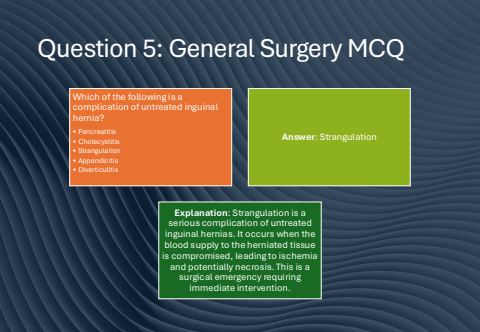 Question 5: General Surgery MCQWhich of the following is a complication of untreated inguinal hernia?%u2022 Pancreatitis%u2022 Cholecystitis%u2022 Strangulation%u2022 Appendicitis%u2022 DiverticulitisAnswer: StrangulationExplanation: Strangulation is a serious complication of untreated inguinal hernias. It occurs when the blood supply to the herniated tissue is compromised, leading to ischemia and potentially necrosis. This is a surgical emergency requiring immediate intervention.