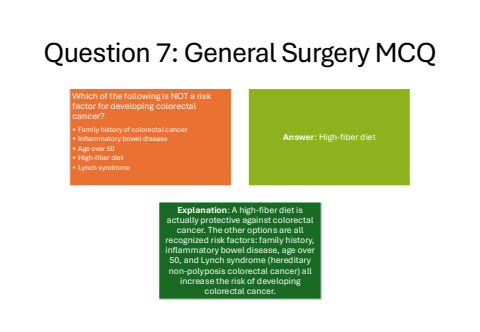 Question 7: General Surgery MCQWhich of the following is NOT a risk factor for developing colorectal cancer?%u2022 Family history of colorectal cancer%u2022 Inflammatory bowel disease%u2022 Age over 50%u2022 High-fiber diet%u2022 Lynch syndromeAnswer: High-fiber dietExplanation: A high-fiber diet is actually protective against colorectal cancer. The other options are all recognized risk factors: family history, inflammatory bowel disease, age over 50, and Lynch syndrome (hereditary non-polyposis colorectal cancer) all increase the risk of developing colorectal cancer.
