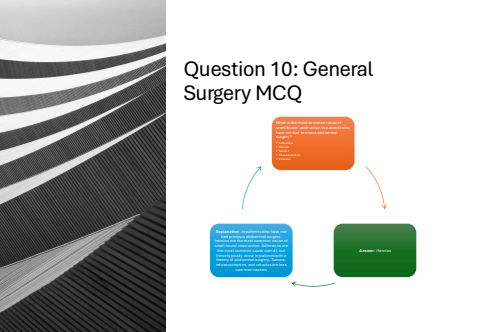 Question 10: General Surgery MCQWhat is the most co mmon cause of small bo wel obstr uction in p atients who have not had previou s abd ominal surgery ?%u2022 Adhesions%u2022 Hernias%u2022 Tumors%u2022 Int ussuscept ion%u2022 VolvulusAnswer: HerniasExplanation: In patien ts who have not had pr evious abdominal su rgery, hernias are the most common cau se of small bo wel obstr uction. Ad hesio ns are the most co mmon cause over all, but these typically occur in p atients with a history of abd ominal surgery. Tumors, intu ssusception, and volvulu s are less common causes.
