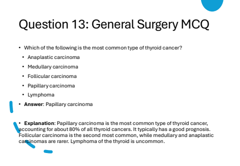 Question 13: General Surgery MCQ%u2022 Which of the following is the most common type of thyroid cancer?%u2022 Anaplastic carcinoma%u2022 Medullary carcinoma%u2022 Follicular carcinoma%u2022 Papillary carcinoma%u2022 Lymphoma%u2022 Answer: Papillary carcinoma%u2022 Explanation: Papillary carcinoma is the most common type of thyroid cancer, accounting for about 80% of all thyroid cancers. It typically has a good prognosis. Follicular carcinoma is the second most common, while medullary and anaplastic carcinomas are rarer. Lymphoma of the thyroid is uncommon.