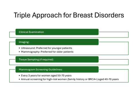 Triple Approach for Breast DisordersClinical Examination%u2022 Ultrasound: Preferred for younger patients%u2022 Mammography: Preferred for older patientsImaging:Tissue Sampling (if required)%u2022 Every 3 years for women aged 50-70 years%u2022 Annual screening for high-risk women (family history or BRCA+) aged 40-70 yearsMammogram Screening Guidelines: