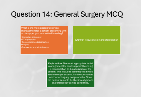 Question 14: General Surgery MCQWhat is the most appropriate initial management for a patient presenting with acute upper gastrointestinal bleeding?%u2022Immediate endoscopy%u2022CT angiography%u2022Resuscitation and stabilization%u2022Surgery%u2022Tranexamic acid administrationAnswer: Resuscitation and stabilizationExplanation: The most appropriate initial management for acute upper GI bleeding is resuscitation and stabilization of the patient. This includes securing the airway, establishing IV access, fluid resuscitation, and correcting any coagulopathy. Once the patient is stable, further investigations like endoscopy can be performed.