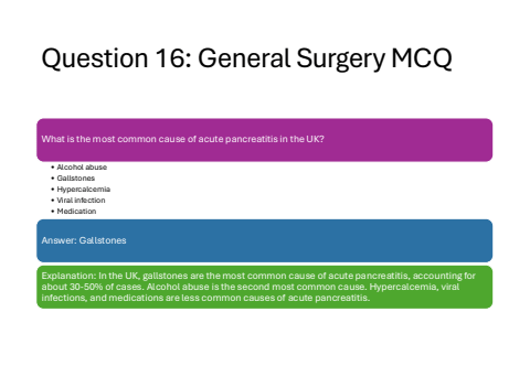 Question 16: General Surgery MCQWhat is the most common cause of acute pancreatitis in the UK?%u2022 Alcohol abuse%u2022 Gallstones%u2022 Hypercalcemia%u2022 Viral infection%u2022 MedicationAnswer: GallstonesExplanation: In the UK, gallstones are the most common cause of acute pancreatitis, accounting for about 30-50% of cases. Alcohol abuse is the second most common cause. Hypercalcemia, viral infections, and medications are less common causes of acute pancreatitis.