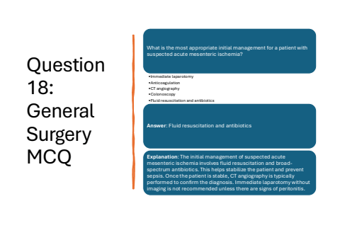 Question 18: General Surgery MCQWhat is the most appropriate initial management for a patient with suspected acute mesenteric ischemia?%u2022Immediate laparotomy%u2022Anticoagulation%u2022CT angiography%u2022Colonoscopy%u2022Fluid resuscitation and antibioticsAnswer: Fluid resuscitation and antibioticsExplanation: The initial management of suspected acute mesenteric ischemia involves fluid resuscitation and broadspectrum antibiotics. This helps stabilize the patient and prevent sepsis. Once the patient is stable, CT angiography is typically performed to confirm the diagnosis. Immediate laparotomy without imaging is not recommended unless there are signs of peritonitis.