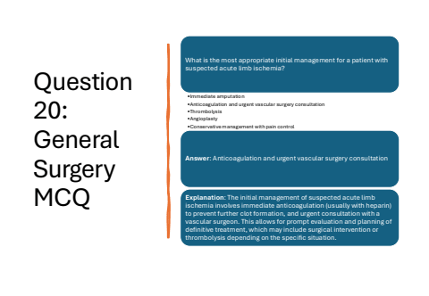 Question 20: General Surgery MCQWhat is the most appropriate initial management for a patient with suspected acute limb ischemia?%u2022Immediate amputation%u2022Anticoagulation and urgent vascular surgery consultation%u2022Thrombolysis%u2022Angioplasty%u2022Conservative management with pain controlAnswer: Anticoagulation and urgent vascular surgery consultationExplanation: The initial management of suspected acute limb ischemia involves immediate anticoagulation (usually with heparin) to prevent further clot formation, and urgent consultation with a vascular surgeon. This allows for prompt evaluation and planning of definitive treatment, which may include surgical intervention or thrombolysis depending on the specific situation.