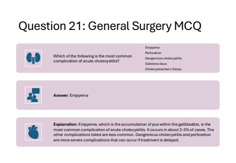Question 21: General Surgery MCQWhich of the following is the most common complication of acute cholecystitis?EmpyemaPerforationGangrenous cholecystitisGallstone ileusCholecystoenteric fistulaAnswer: EmpyemaExplanation: Empyema, which is the accumulation of pus within the gallbladder, is the most common complication of acute cholecystitis. It occurs in about 2-3% of cases. The other complications listed are less common. Gangrenous cholecystitis and perforation are more severe complications that can occur if treatment is delayed.