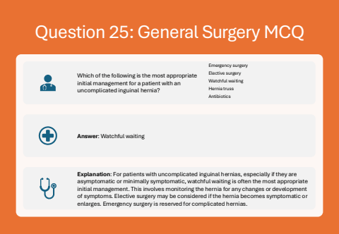 Question 25: General Surgery MCQWhich of the following is the most appropriate initial management for a patient with an uncomplicated inguinal hernia?Emergency surgeryElective surgeryWatchful waitingHernia trussAntibioticsAnswer: Watchful waitingExplanation: For patients with uncomplicated inguinal hernias, especially if they are asymptomatic or minimally symptomatic, watchful waiting is often the most appropriate initial management. This involves monitoring the hernia for any changes or development of symptoms. Elective surgery may be considered if the hernia becomes symptomatic or enlarges. Emergency surgery is reserved for complicated hernias.