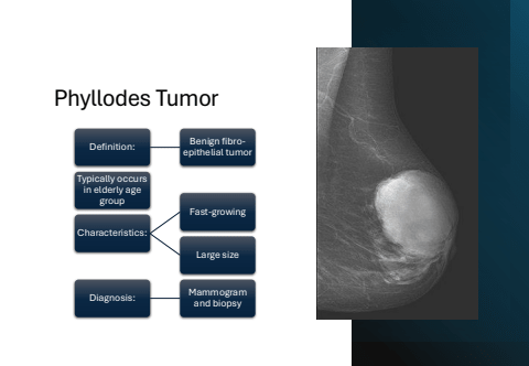 Phyllodes TumorDefinition: Benign fibro,epithelial tumorTypically occurs in elderly age groupCharacteristics:Fast-growingLarge sizeDiagnosis: Mammogram and biopsy