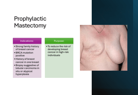 Prophylactic MastectomyIndications:%u2022Strong family history of breast cancer%u2022BRCA mutation positive%u2022History of breast cancer in one breast%u2022Biopsy suggestive of lobular carcinoma in situ or atypical hyperplasiaPurpose:%u2022 To reduce the risk of developing breast cancer in high-risk individuals