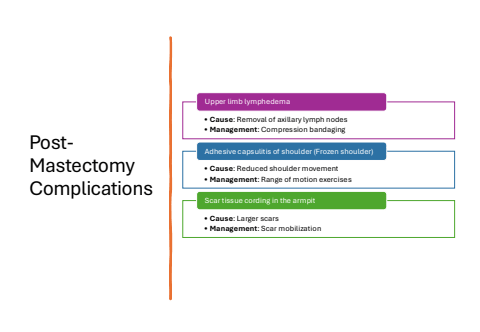 PostMastectomy Complications%u2022 Cause: Removal of axillary lymph nodes%u2022 Management: Compression bandagingUpper limb lymphedema%u2022 Cause: Reduced shoulder movement%u2022 Management: Range of motion exercisesAdhesive capsulitis of shoulder (Frozen shoulder)%u2022 Cause: Larger scars%u2022 Management: Scar mobilizationScar tissue cording in the armpit