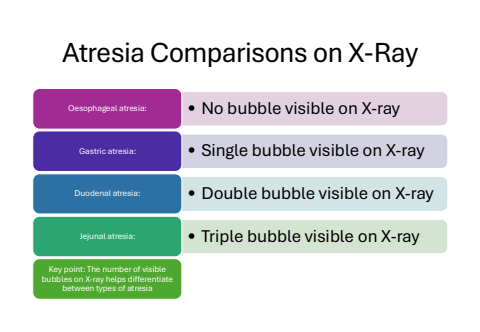 Atresia Comparisons on X-RayOesophageal atresia: %u2022 No bubble visible on X-rayGastric atresia: %u2022 Single bubble visible on X-rayDuodenal atresia: %u2022 Double bubble visible on X-rayJejunal atresia: %u2022 Triple bubble visible on X-rayKey point: The number of visible bubbles on X-ray helps differentiate between types of atresia