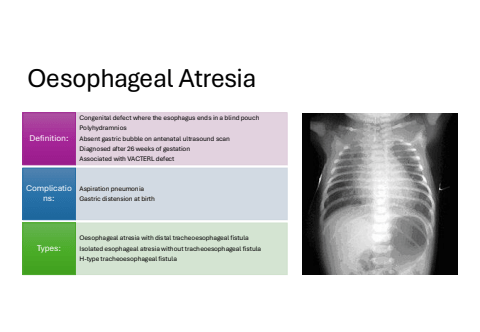 Oesophageal AtresiaCongenital defect where the esophagus ends in a blind pouchPolyhydramniosAbsent gastric bubble on antenatal ultrasound scanDiagnosed after 26 weeks of gestationAssociated with VACTERL defectDefinition:Aspiration pneumoniaGastric distension at birthComplications:Oesophageal atresia with distal tracheoesophageal fistulaIsolated esophageal atresia without tracheoesophageal fistulaH-type tracheoesophageal fistulaTypes: