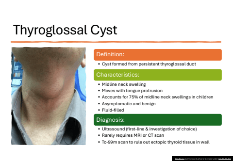 Thyroglossal CystDefinition:%u2022 Cyst formed from persistent thyroglossal ductCharacteristics:%u2022 Midline neck swelling%u2022 Moves with tongue protrusion%u2022 Accounts for 75% of midline neck swellings in children%u2022 Asymptomatic and benign%u2022 Fluid-filledDiagnosis:%u2022 Ultrasound (first-line & investigation of choice)%u2022 Rarely requires MRI or CT scan%u2022 Tc-99m scan to rule out ectopic thyroid tissue in wallThis Photo by Unkno wn Author is licensed under CC BY-SA-NC