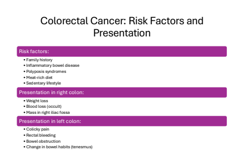 Colorectal Cancer: Risk Factors and PresentationRisk factors:%u2022 Family history%u2022 Inflammatory bowel disease%u2022 Polyposis syndromes%u2022 Meat-rich diet%u2022 Sedentary lifestylePresentation in right colon:%u2022 Weight loss%u2022 Blood loss (occult)%u2022 Mass in right iliac fossaPresentation in left colon:%u2022Colicky pain%u2022 Rectal bleeding%u2022 Bowel obstruction%u2022Change in bowel habits (tenesmus)