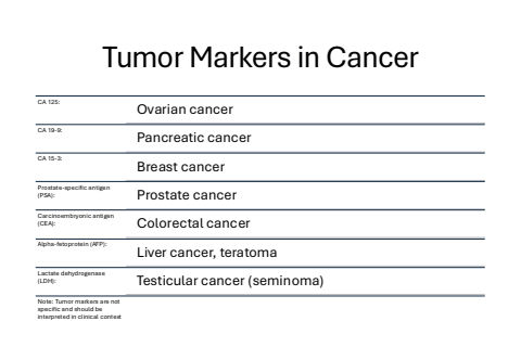 Tumor Markers in CancerCA 125:Ovarian cancerCA 19-9:Pancreatic cancerCA 15-3:Breast cancerProstate-specific antigen (PSA): Prostate cancerCarcinoembryonic antigen (CEA): Colorectal cancerAlpha-fetoprotein (AFP):Liver cancer, teratomaLactate dehydrogenase (LDH): Testicular cancer (seminoma)Note: Tumor markers are not specific and should be interpreted in clinical context
