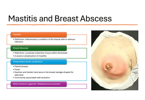 Mastitis and Breast Abscess%u2022 Definition: Inflammatory condition of the breast with or without infectionMastitis:%u2022 Definition: Localized collection of pus within the breast%u2022 A severe complication of mastitisBreast Abscess:%u2022 Painful breast%u2022 Fever%u2022 Swollen and tender hard area in the breast (wedge-shaped for abscess)%u2022 Commonly associated with lactationPresentation (both conditions):Most common organism: Staphylococcus aureus