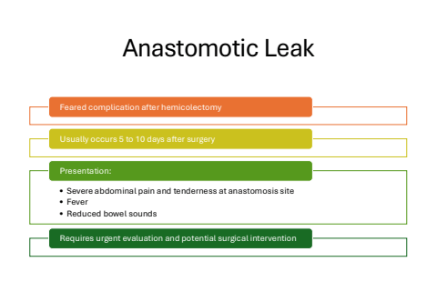 Anastomotic LeakFeared complication after hemicolectomyUsually occurs 5 to 10 days after surgery%u2022 Severe abdominal pain and tenderness at anastomosis site%u2022 Fever%u2022 Reduced bowel soundsPresentation:Requires urgent evaluation and potential surgical intervention