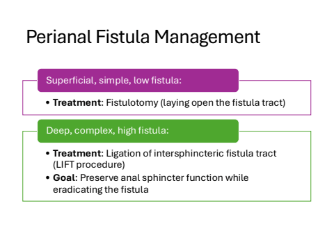 Perianal Fistula Management%u2022 Treatment: Fistulotomy (laying open the fistula tract)Superficial, simple, low fistula:%u2022 Treatment: Ligation of intersphincteric fistula tract (LIFT procedure)%u2022 Goal: Preserve anal sphincter function while eradicating the fistulaDeep, complex, high fistula: