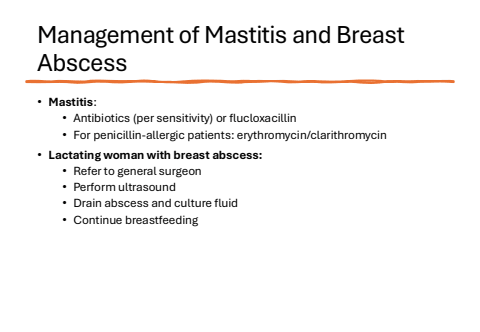 Management of Mastitis and Breast Abscess%u2022 Mastitis:%u2022 Antibiotics (per sensitivity) or flucloxacillin%u2022 For penicillin-allergic patients: erythromycin/clarithromycin%u2022 Lactating woman with breast abscess:%u2022 Refer to general surgeon%u2022 Perform ultrasound%u2022 Drain abscess and culture fluid%u2022 Continue breastfeeding