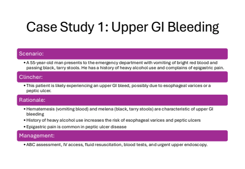 Case Study 1: Upper GI BleedingScenario:%u2022A 55-year-old man presents to the emergency department with vomiting of bright red blood and passing black, tarry stools. He has a history of heavy alcohol use and complains of epigastric pain.Clincher:%u2022 This patient is likely experiencing an upper GI bleed, possibly due to esophageal varices or a peptic ulcer.Rationale:%u2022Hematemesis (vomiting blood) and melena (black, tarry stools) are characteristic of upper GI bleeding%u2022History of heavy alcohol use increases the risk of esophageal varices and peptic ulcers%u2022Epigastric pain is common in peptic ulcer diseaseManagement:%u2022ABC assessment, IV access, fluid resuscitation, blood tests, and urgent upper endoscopy.