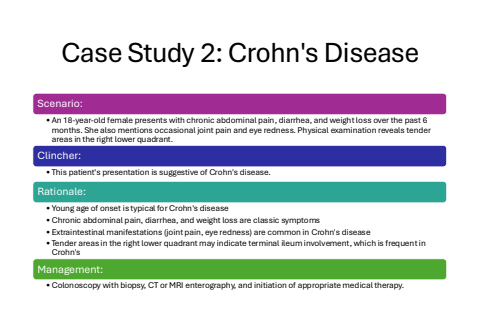 Case Study 2: Crohn's DiseaseScenario:%u2022 An 18-year-old female presents with chronic abdominal pain, diarrhea, and weight loss over the past 6 months. She also mentions occasional joint pain and eye redness. Physical examination reveals tender areas in the right lower quadrant.Clincher:%u2022 This patient's presentation is suggestive of Crohn's disease.Rationale:%u2022 Young age of onset is typical for Crohn's disease%u2022Chronic abdominal pain, diarrhea, and weight loss are classic symptoms%u2022 Extraintestinal manifestations (joint pain, eye redness) are common in Crohn's disease%u2022 Tender areas in the right lower quadrant may indicate terminal ileum involvement, which is frequent in Crohn'sManagement:%u2022Colonoscopy with biopsy, CT or MRI enterography, and initiation of appropriate medical therapy.