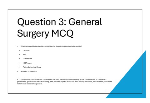 Question 3: General Surgery MCQ%u2022 What is the gold standard investigation for diagnosing acute cholecystitis?%u2022 CT scan%u2022 MRI%u2022 Ultrasound%u2022 HIDA scan%u2022 Plain abdominal X-ray%u2022 Answer: Ultrasound%u2022 Explanation: Ultrasound is considered the gold standard for diagnosing acute cholecystitis. It can detect gallstones, gallbladder wall thickening, and pericholecystic fluid. It is also readily available, non-invasive, and does not involve radiation exposure.